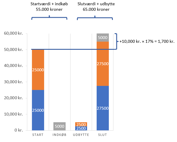 Vi kan godt lide idéen om at få udbetalt udbytte, så derfor har vi 31. december 2020 værdier for 50.000 kroner i forskellige investeringsforeninger på aktiesparekontoen. I februar udbetaler de så udbytte svarende til i alt 5.000 kroner. De 5.000 kroner bruger vi selvfølgelig på at købe mere i investeringsforeningerne da vi har hørt noget om rentes rente. I løbet af året indskyder vi selv for yderlig 5.000 kroner mere og værdien ved årets udgang er på 60.000 kroner.