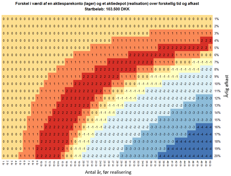 Så de blå farver er tilfælde hvor et aktiedepot er bedre, mens de røde farver viser hvor aktiesparekontoen er det bedst valg. Så, hvis man er i stand til at få et afkast på 13% per år i 30 år, vil aktiedepotet være det bedste valg, men hvis man regner med et afkast på omkring 7% per år, er det aktiesparekontoen der er bedst.