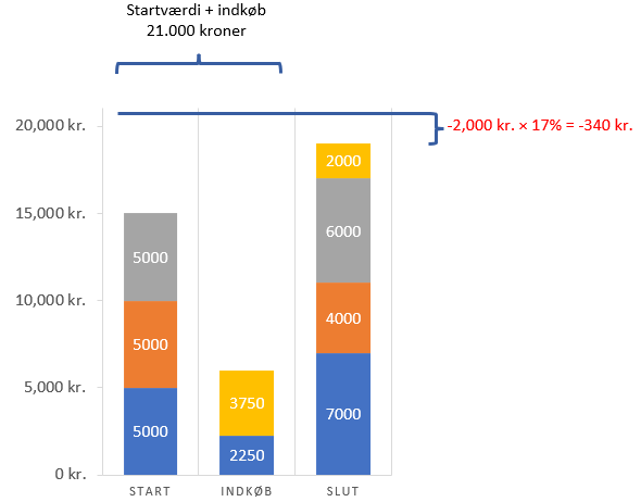 Som i eksempel 2, ligger man værdien ved starten af året sammen med eventuelle indkøb og derefter sammenligner med den samlet værdi ved årets udgang. Så hvis der var en startværdi plus indkøb svarende til 21.000 kroner i 2021 og ved slutningen af året var den samlet værdi på 19.000 kroner. Det svarer til et samlet fald på 2.000 kroner, der giver en negativ skat på -2.000 kroner × 17% = -340 kroner.