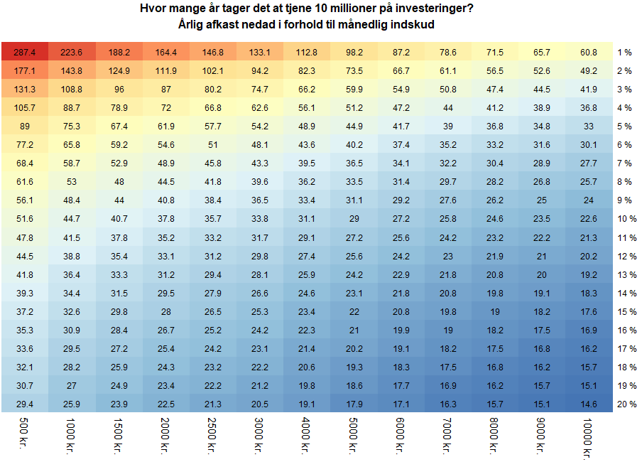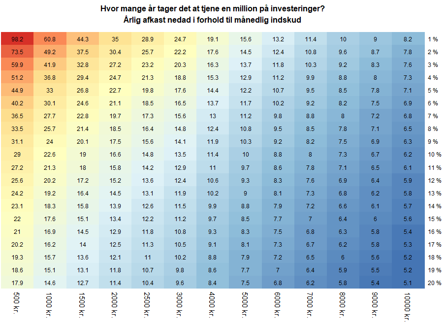 I alle tilfælde er der nok langt tid til at den drøm kan lade sig gøre. Men det fik mig til at tænke, hvor lang tid tager det faktisk at tjene en million på investeringer? Ja, som så mange andre gange er svaret ”det kommer an på…”. I dette tilfælde hvor meget man kan ligge til side hver måned (og månedlig indskud er det mest fornuftige for de fleste) og hvor stort et afkast man har om året. Så jeg prøvede at udregne det for forskellige input og sætte det op i en fin tabel.