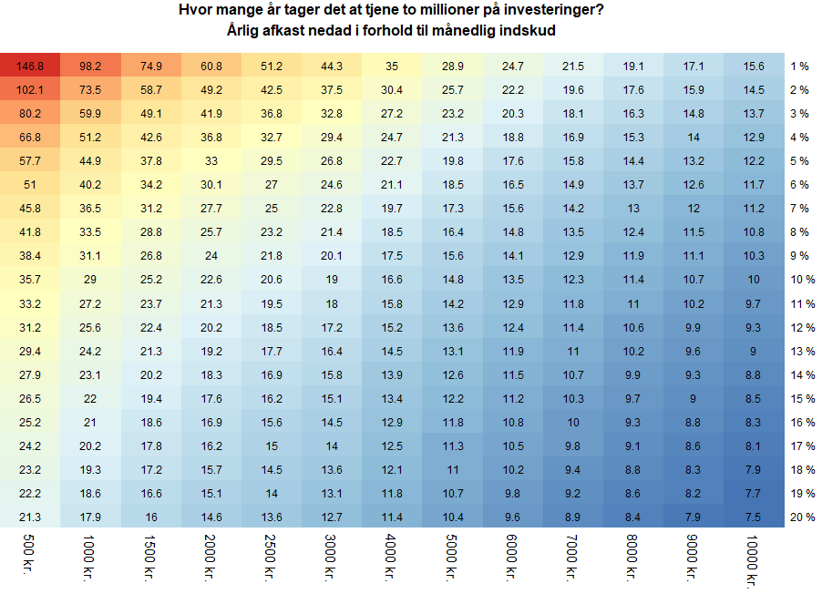 Så henad er der forskellige indskud per måned og nedad hvor meget afkast man regner med per år. Så, hvis man kan ligge 2.000 kroner til side hver måned og får et årligt afkast på 8% så tager det 18 og et halvt år at ramme millionen. Man kan også bruge det omvendt, og sige jeg har 10 år til at få en million, og jeg forventer at kunne få 10% om året. Så skal jeg ligge 5.000 kroner til side om måneden. (N.B. her er der ikke medregnet skat eller inflation).