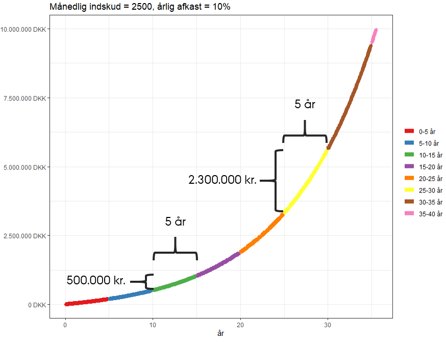 Med et indskud på 2.500 kroner om måneden og et afkast på 10% tager det stadig næsten 3 år før der står 100.000 kroner og over fem år før man runder 200.000 kroner. Men så efter 10 år er der over en halv million – og fem år efter det en hel million. Så, man har på de første fem år opsparet 200.000 kroner, mens de fem år fra år 10 til år 15 har optjent 500.000. Nu begynder det at ligne noget! De fem år fra år 20 til år 25 er det røget næsten halvanden million ind.