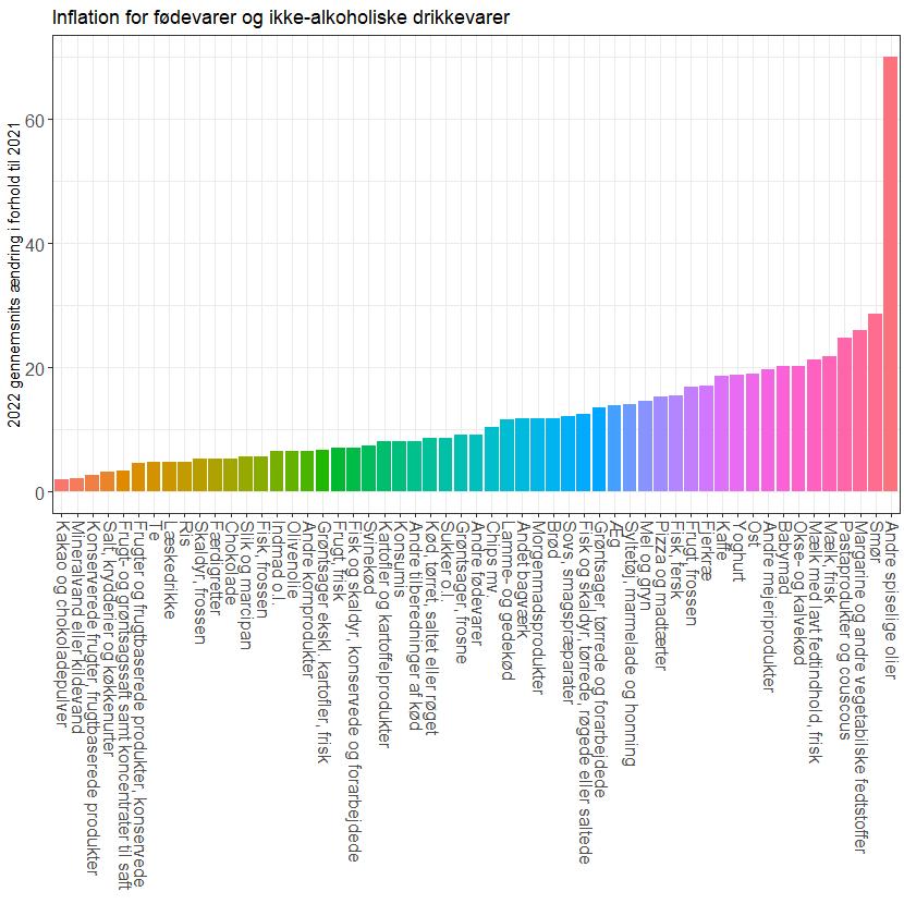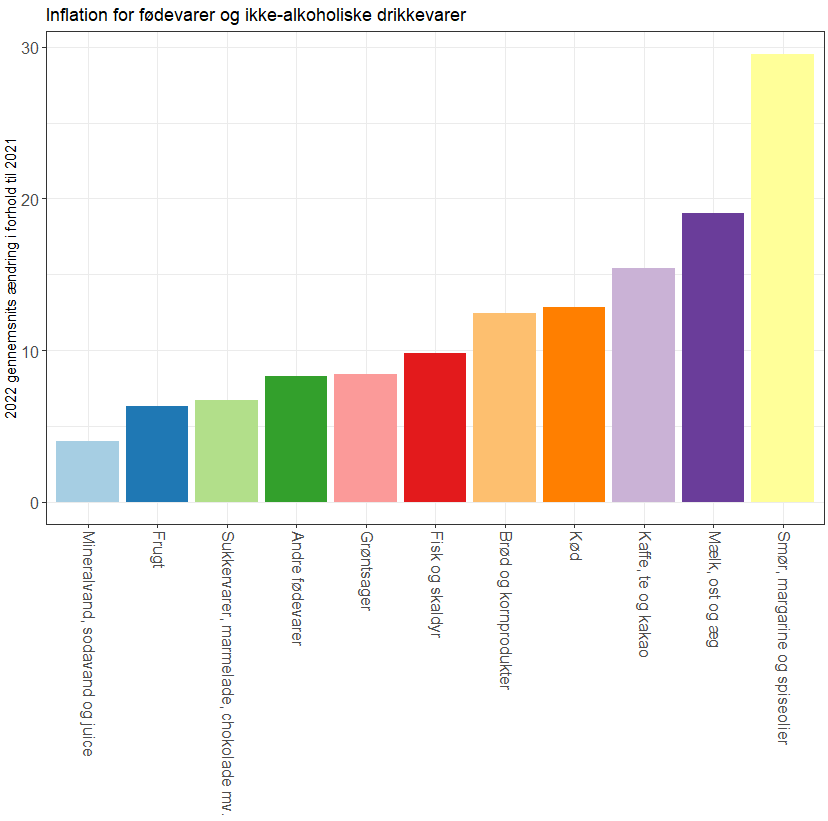 Inflationen har specielt ramt ting som fødevarer, transport og bolig (herunder opvarmning), men i mindre grad sundhed, uddannelse og beklædning. Nu sidder du sikkert og tænker ”Men hallo! Smør er jo steget meget mere end 12% i forhold til sidste år, det kan ikke passe!” Men det var jo de 12 overordnet kategorier. Vi kan gå et lag dybere i data og kigge mere på præcis hvilke grupper af fødevarer det er mest ramt af inflationen.