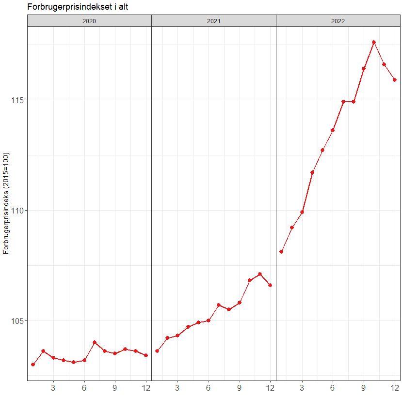 Hvis man kigger på kurven over forbrugsindekset i løbet af de sidste par år, så er det også tydeligt at 2022 har været et helt anderledes år i forhold til inflation.