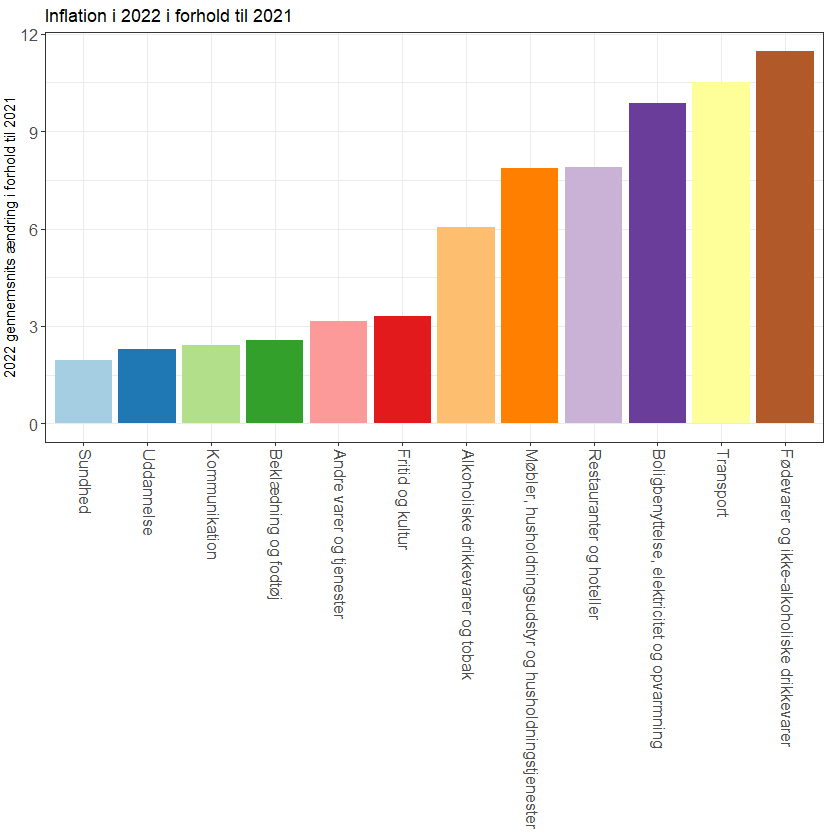 I Danmark har vi haft en længere årrække med meget lav inflation (gennemsnit på 0,7% fra 2013 til 2020). Det har så også betydet at vi har været vant til små prisstigninger. Men i 2022 endte inflation på hele 7,7%, godt ti gange så høj som vi ellers havde vænnet os til. Så hvis man f.eks. havde udgifter for 5.000 kroner om måneden i 2021 skulle man betale 5385 kroner for de samme ting i 2022 (svarende til 4.620 kroner om året – dvs. næsten en hel ekstra måned).