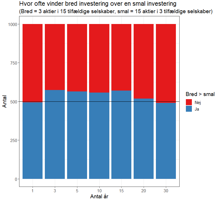 Jeg har 1000 sæt bestående af 3 aktier i 15 selskaber og 1000 sæt af 15 aktier i 3 selskaber for 7 forskellige tidsperioder (dvs. 14.000 forskellige sæt i alt). Herefter har jeg opgjort hvor ofte en bred investering med 15 selskaber har haft højere inflationsjusteret stigning end en smal investering med 3 selskaber.