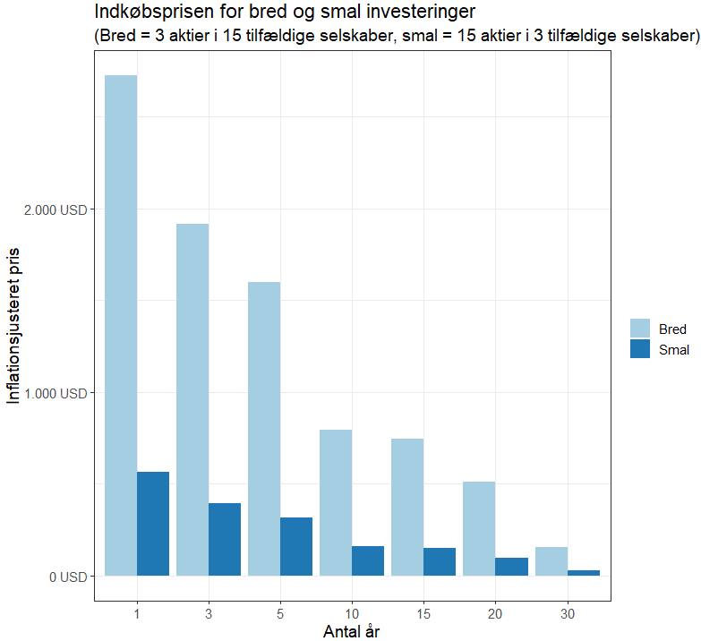 Her er det tydeligt at det i gennemsnit er langt billigere at købe 15 aktier i 3 tilfældige selskaber end 3 aktier i 15 tilfældige selskaber. Jeg har justeret for inflation, men alligevel bliver det billigere jo længere man går tilbage i tiden. Men det er jo også fordi at hele markedet et steget i værdi, så det er ikke så mærkeligt. Hvis man vælger 15 tilfældige selskaber, så er chance også større for at ramme nogle dyre aktier end hvis man vælger 3. Derfor er selve antallet af aktier man køber i denne sammenhæng heller ikke så vigtig i forhold til den samlede pris (i gennemsnit).