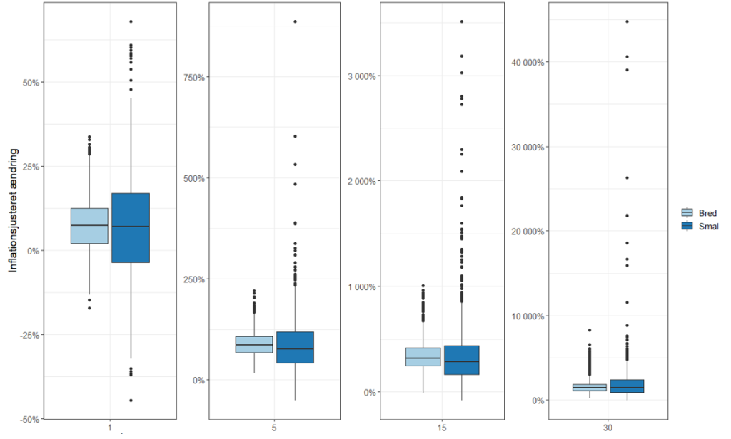 Det viser sig at median ændringen er 3 aktier i 15 selskaber er næsten ens til median ændring for 15 aktier i 3 selskaber, lige meget hvor lang tid der går. Men det er mere tydeligt at den mørkeblå boks (3 selskaber) er tykkere end den lyseblå (15 selskaber). Dette betyder at der er større udsving i ændringerne for de 1000 simuleringer når man har få selskaber i forhold til mange. De lodrette streger, strækker sig også længere op og ned for 3 selskaber, og der er langt flere outliers. Det betyder kort fortalt, at der er en større chance for at få en kæmpe gevinst ved at vælge færre selskaber men så investere mere i dem, frem for at vælge mange selskaber. Men, det betyder også at risikoen for at tabe meget er tilsvarende større.