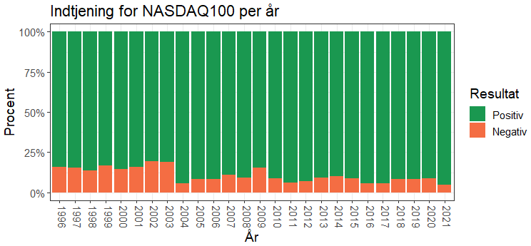 Jeg har brugt den nuværende (januar 2022) liste af firmaer på NASDAQ100 indekset. Der har været mange udskiftninger over årene, men pointen her er hvordan en samling er firmaer udvikler sig over tid. Så jeg har taget de 101 aktier på NASDAQ100 og hentet deres ”earnings per share” (EPS) samt lukkekursen for hvert år siden 1996, hvis det fandtes. Derved kunne jeg udregne P/E ratioen for alle 101 aktier over 25 år. Hvis man først kigger på hvor mange der har haft en positiv indtjening (da P/E ratioen typisk ikke udregnes for negativ EPS) har langt de fleste haft positiv indtjening, selv i år hvor markedet er gået nedad.