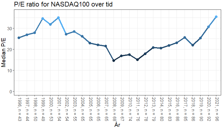 Det er værd at huske på at P/E ratioen bliver høj hvis kursen er høj i forhold til indtjeningen. Så man kan se at da NASDAQ100 havde et peak omkring år 2000, var median P/E ratio også høj – og her i 2021 hvor NASDAQ100 også er meget høj er P/E ratioen igen nået højt op.