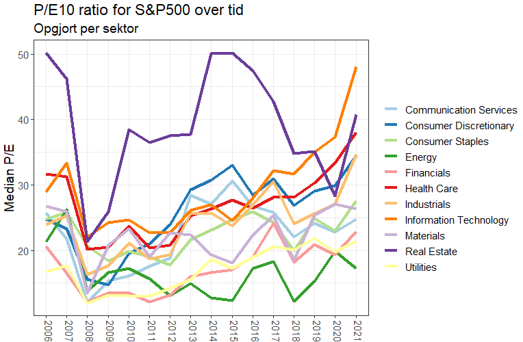 Shiller P/E for S&P500 generelt ligger på omkring 38 for slutningen af 2021, men det er alligevel interessant at se der kan være stor forskel i hvilke sektorer der ligger over og under gennemsnittet.
