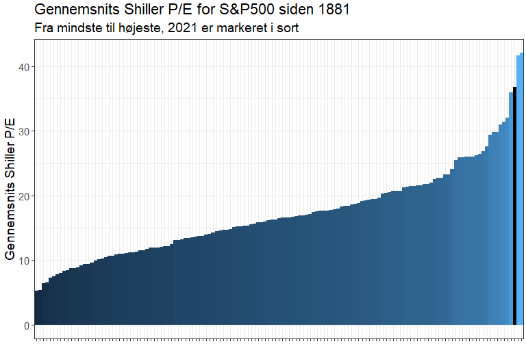 Lige nu er Shiller P/E meget høj, faktisk havde 2021 med et gennemsnit på 36,8 den tredje højeste Shiller P/E siden 1881.