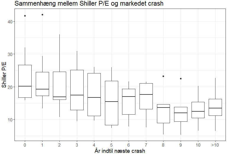 Jeg fandt en liste over 31 amerikanske aktiemarkedet crashes på wikipedia. Og jeg har fra tidligere udregnet den gennemsnitlige Shiller P/E for hvert år baseret på data fra manden selv. Så hvis man bare plotter tid (i år) indtil det næste crash og Shiller P/E så er der faktisk meget pæn sammenhæng.