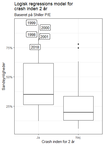 Som man kan se, er der generelt højere sandsynlighed i gruppen der faktisk har et crash, men der er også nogle outliers med høje sandsynligheder for crash i den gruppe der ikke har haft et crash. Men i det data, ligger 1999 og 2000 med en sandsynlighed på 95% for et crash inden for 2 år, hvilket passer godt sammen med dot-com boblen.
