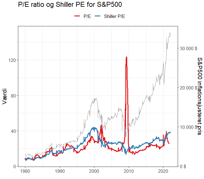 P/E ratioen per år i rød og Shiller P/E i blåt (venstre akse) og S&P500 prisen justeret for inflation i gråt siden 1980 (højre akse).
