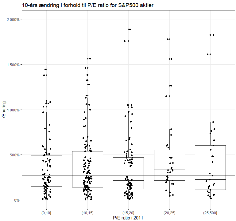 Jeg gik ind i dette indlæg med en forventning om at en lav P/E ratio måske var et ok værktøj til at udvælge langsigtede aktier på, for det var det jeg har læst mange andre steder. Men, jeg har ikke kunne finde noget stæk empirisk evidens for det. Så, som jeg har skrevet før, så er P/E ratioen nok ikke det eneste man skal udvælge en aktie ud fra.