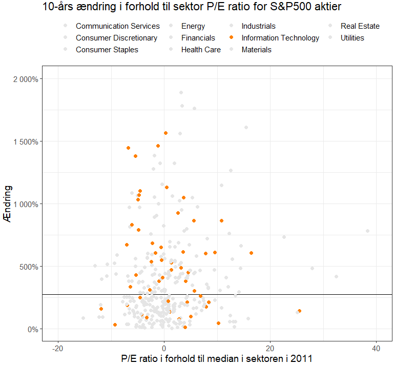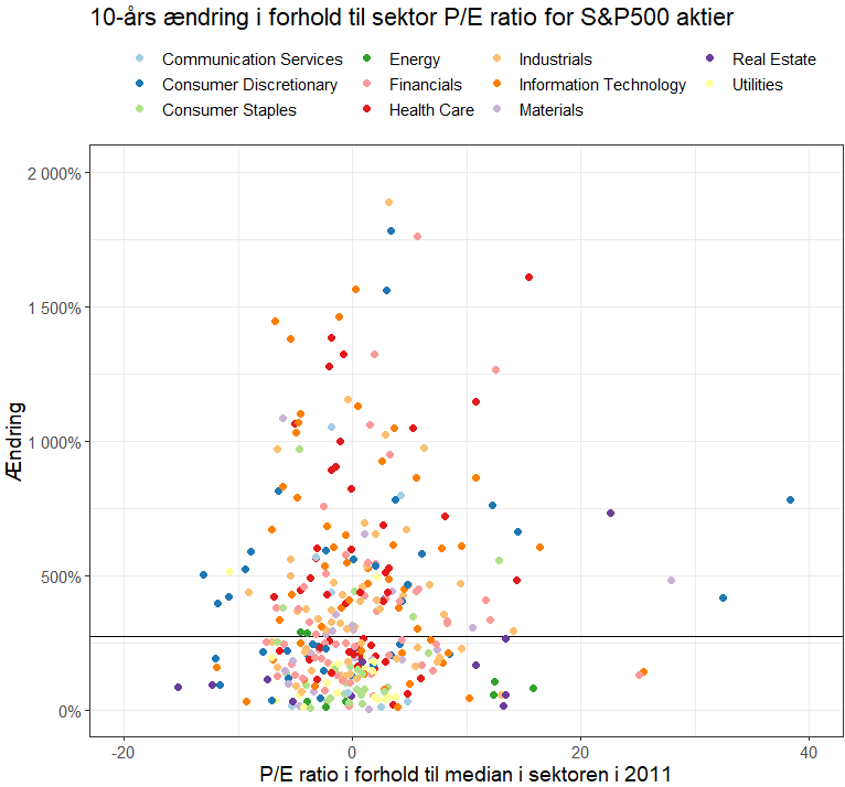 Nu har jeg tidligere skrevet om at der er stor forskel på hvad en høj og lav P/E ratio er, alt efter hvilke sektor aktien befinder sig i. Så det giver måske også mening at udregne en P/E i forhold til sektoren her? Jeg har derfor udregnet P/E ratio i forhold til median P/E ratio for sektoren. Dvs. en negativ værdi angiver P/E ratioen var under medianen, mens en positiv værdi betyder at P/E ratioen var over medianen i sektoren.