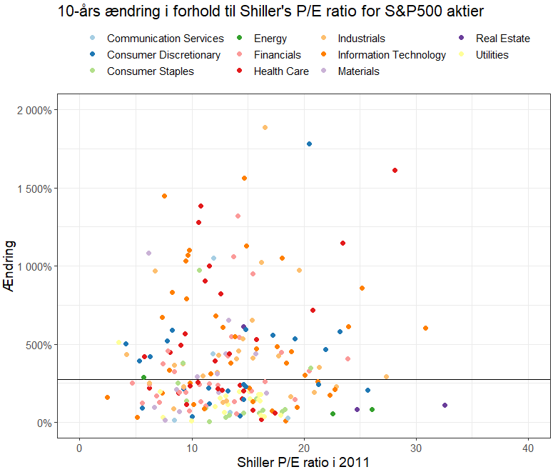 Jeg skrev også tidligere om at Shiller P/E skulle være god til at justerer for udsving på den korte bane. Så måske den mangel på sammenhæng mellem lav P/E ratio og stigning i aktiekurs bare er fordi at et års P/E ratio er ustabilt? Men, nej – det er samme historie når man bruger Shiller P/E i 2011 til at forudsige kursen i 2021.