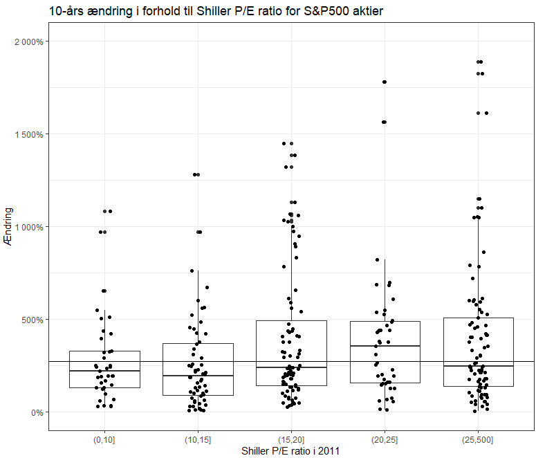 Så, en lav Shiller P/E er lige et dårlig til at forudsige en stigning over 10 år som gennemsnitlig P/E ratio. Igen er det faktisk aktier med en Shiller P/E ratio et sted mellem 20 og 25 der har den bedste median stigning over 10 år.