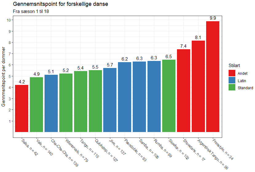 Her er det nok, som forventet freestyle dansen det får den højeste score, da den kun danses i finalen hvor der også er blevet trænet mest og det kun er de bedste der er tilbage. Til gengæld skal man holde sig fra Engelsk Vals og Cha-Cha-Cha, da de kun i gennemsnit over de 140 gange de er blevet danset, har scoret lige omkring en 5 fra hver dommer. Bedre er det med Slowfox der i gennemsnit får 6.5 fra dommerne. Og det går helt galt med Salsa, hold jer langt væk fra Salsa!