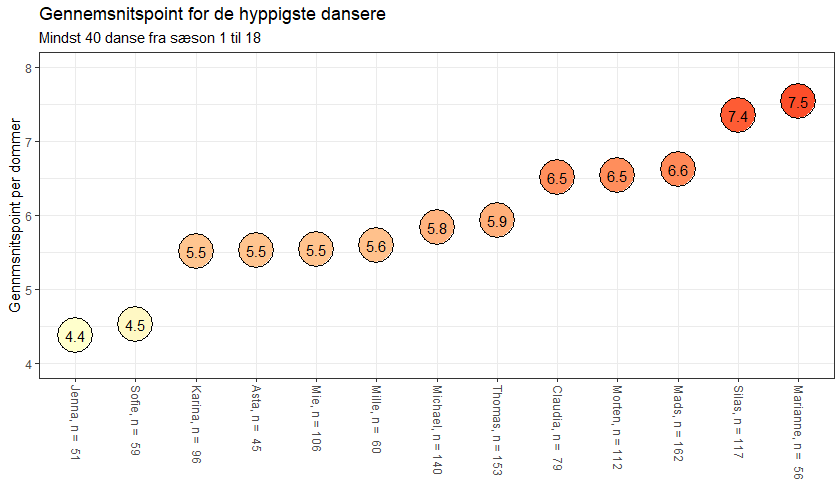 Alle er jo deres favoritter, men det virker som om nogle af de professionelle dansere, bare altid kommer langt. Der har været lige omkring 230 dansere (når man tæller både professionelle og nydansere med) i de 18 sæsoner, men kun 13 har haft mere end 40 danse.