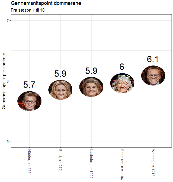 Dommerne giver tit ret ens karakterer, men de er nogle gange lidt uenige. Jeg har taget udgangspunkt i de fem dommere der er med i denne sæson, nemlig Nikolaj Hübbe, Anne Laxholm, Britt Bendixen, Marianne Eihilt og Jens Werner. De har på Wikipedia giver point mere end 4.500 gange tilsammen, så det er et meget solidt grundlag at bedømme ud fra. Hvis man udregner deres gennemsnitskarakter over alle karakter de nogensinde har givet er der alligevel en lille forskel fra en ene ende til den anden ende af bordet.