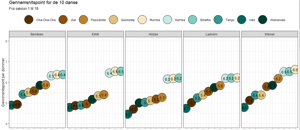 I gennemsnit giver Hübbe næsten et halv point lavere karakter end Werner (mon det er derfor de sidder i hver sin ende af bordet?). Men har hver dommer så også en favoritdans?